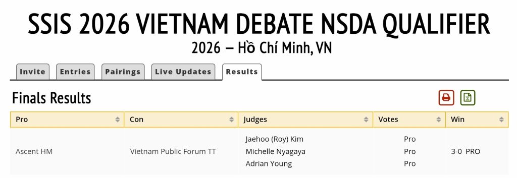 Dear All, We are pleased to share that the Vietnam National Public Forum Debate Team earned the silver medal at the Vietnam NSDA Qualifier...
